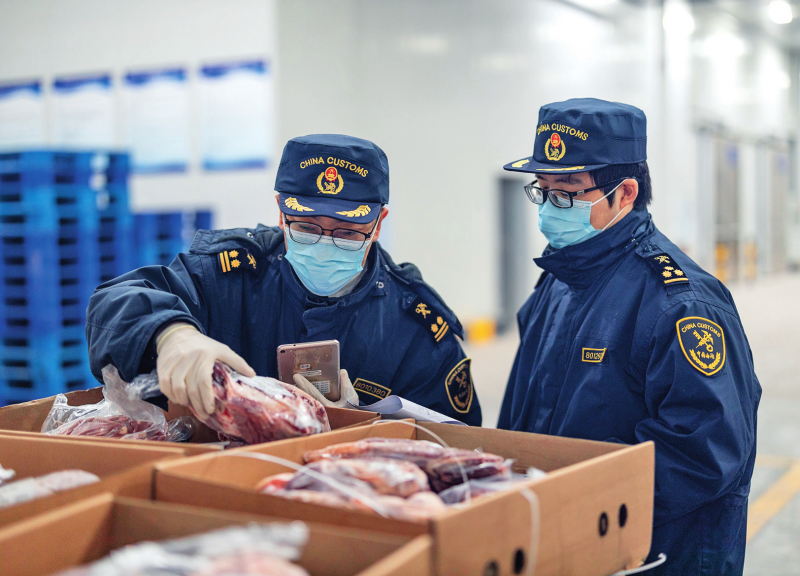 正在沉庆国际物流枢纽园区,沉庆海关所属渝州海关的工做人员正细心检验通过 西部陆海新通道进口的牛肉(2025 年 1 月 17 日摄) 黄伟摄 / 本刊