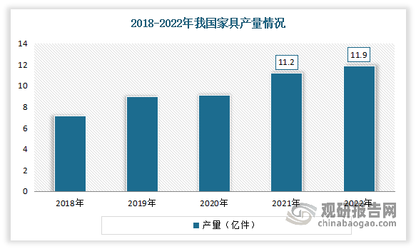 近年来房地产行业的飞速成长带动家具需求增加,家具制制进入快速成长期,出产供给持续添加。数据显示,22021年我国度具产量冲破10亿件,为11。2亿件,较上年同比增加22。81%。2022年我国度具产量进一步增加,达到11。9亿件,较上年同比增加6。25%。