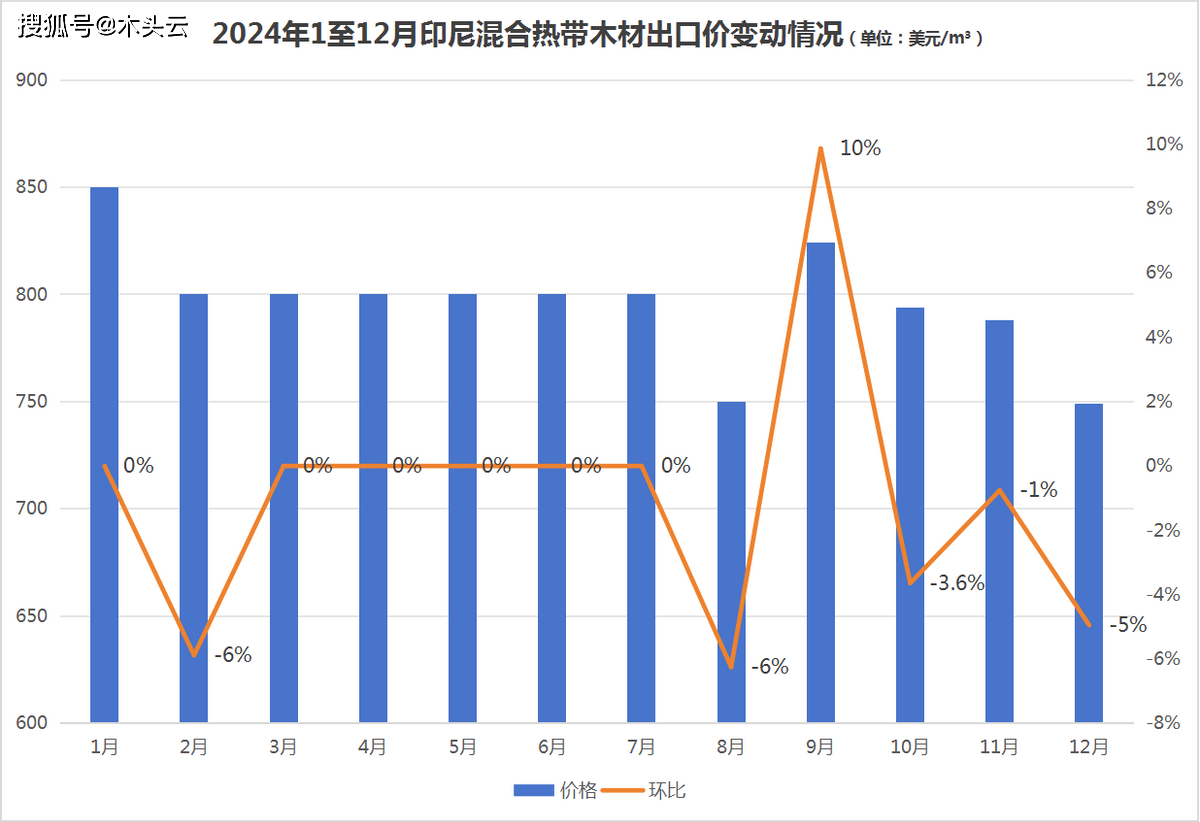 印尼夹杂热带木材方面,全年出口价峰值呈现正在1月,其余月份表示较为不变,根基维持正在800美元/立方的程度。而正在8月呈现了全年最低程度,环比下降了6%;随后正在9月攀升至824美元/立方米,环比增加10%。10月至12月持续三月下跌。