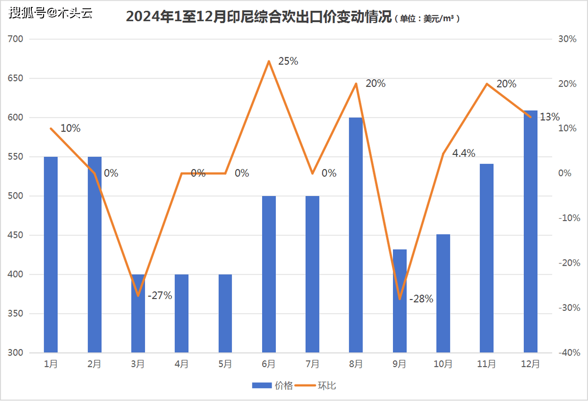 回首2024年,印尼柳桉出口价正在3月至7月履历了较长一段不变期,随后正在8月环比上涨了10%后,冲破1300美元/立方米,同比增加17%,环比增加22%。及至岁尾12月,印尼柳桉出口价下调6%,估计至来岁1月价钱还存鄙人调空间。