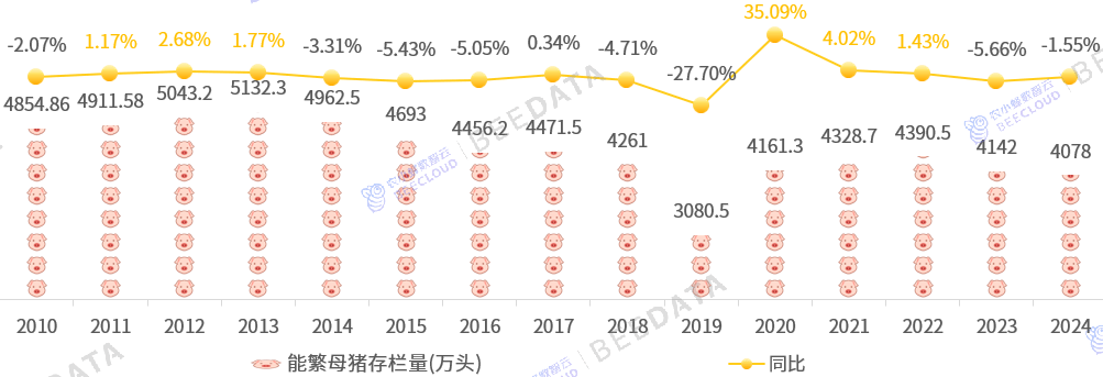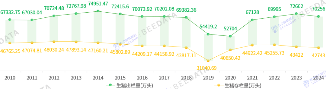 2024年,中国生猪出栏量为70256万头、存栏量为42743万头,同比别离下降了3。3%、1。6%。生猪存栏量的下降可能会对后期的猪肉供应发生必然影响。因而,需要加强养殖办理和不变生猪出产。