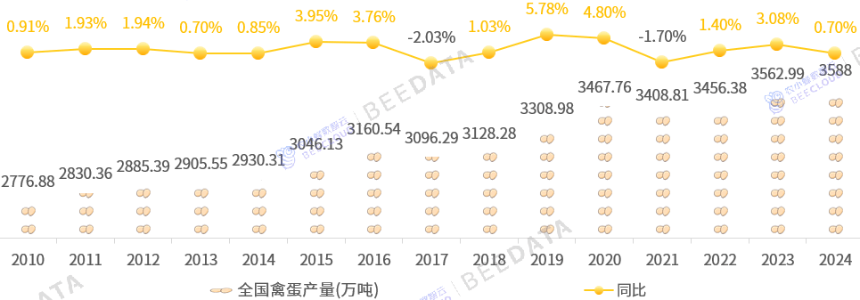 据国度统计局数据显示,2010年以来,中国禽蛋产量仅正在“2017年、2021年”呈现过小幅同比下降趋向,其余年份全体呈正增加态势,2022年~至今已连增3年。2024年,中国禽蛋产量为3588万吨,同比力2023年添加了0。7%。