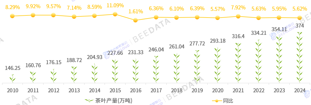 据国度统计局数据显示,新中国成立以来,中国茶叶产量比来一次同比下降发生正在1994年,1995年~至今均连结逐年增加态势。2024年已增至374万吨,同比增量近20万吨、增幅约5。62%。