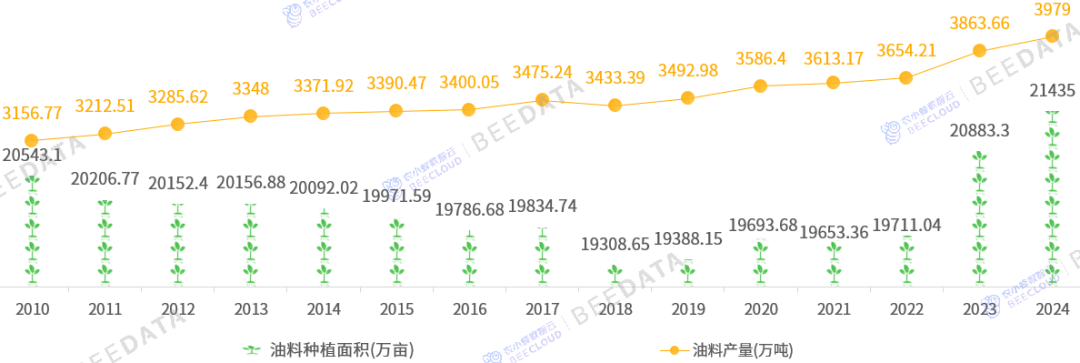 2024年,中国油料种植面积为21435万亩、产量为3979万吨,同比别离较2023年添加了2。64%、2。99%,出产品种以油菜籽、花生为从。连系汗青数据来看,2010年以来,中国油料种植面积已于2022~2024年间连增3年;产量则得益于单产程度的提拔,除2018年外均连结持续添加态势。