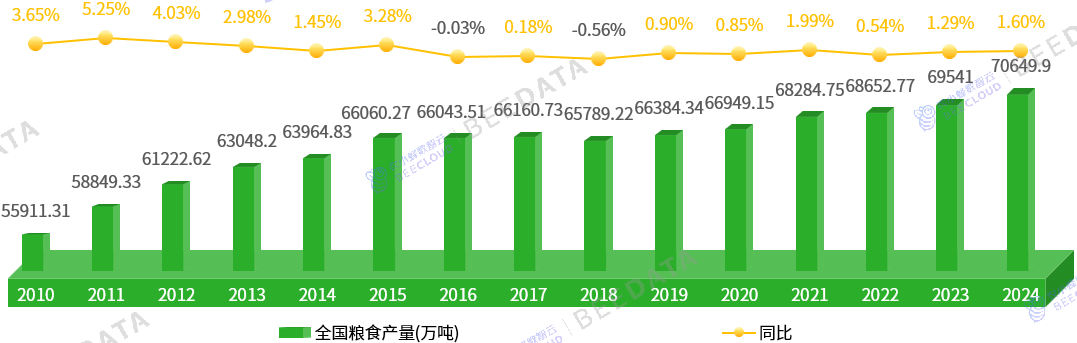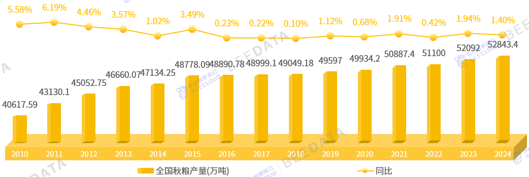 2024年,中国秋粮产量为52843。4万吨,同比增加了1。4%——2010年至今已连增15年,年间同比增幅正在0。1%~6。19%之间不等,进一步拉动了全国粮食总产量的增加。