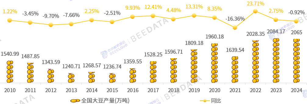 2024年,中国大豆产量为2065万吨,同比下降了0。92%——为近3年来首降,但仍连结正在2000万吨以上。
