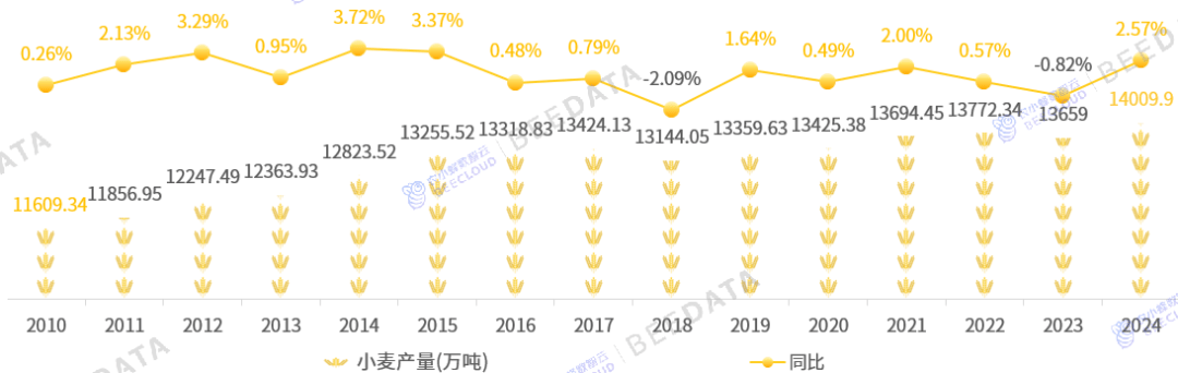2024年,中国夏粮产量回升至14989万吨,同比增加了2。6%——处于汗青最高位。2010年~至今,仅正在2016年、2018年、2023年受极端天气等分析要素影响而呈现过同比下降现象。