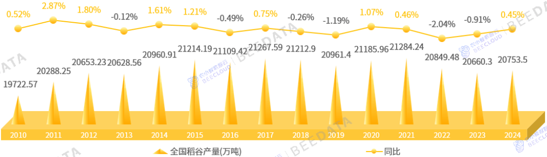 2024年,中国稻谷产量为20753。5万吨,同比增加了0。45%——为2022~2023年连降两年后的初次回升。