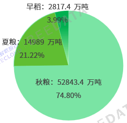 次要细分粮食产物常年呈现“玉米稻谷小麦薯类豆类”的产量布局。此中,玉米产量为29491。7万吨、占比41。74%,稻谷产量为20753。5万吨、占比29。38%,小麦产量为14009。9万吨、占比19。83%,薯类产量为3058。4万吨、占比4。33%,大豆产量为2065万吨、占比2。92%。