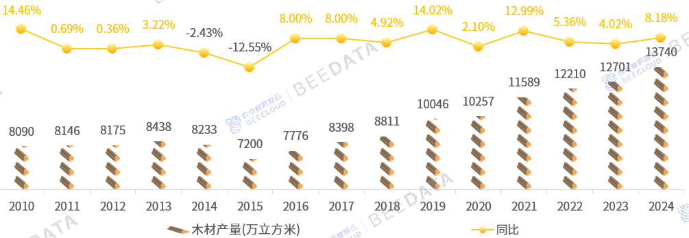 2010年以来,中国木材产量除2014~2015年间有所下降外,均连结逐年增加态势,2016~2024年间已连增9年,2019~2024年间已持续6年连结正在1亿立方米以上。此中,2024年产量为13740万立方米,同比增幅约8。18%。