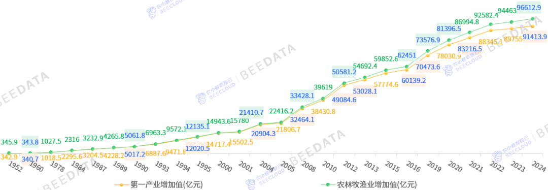 从持久趋向来看,1952年以来,除“1957年、1959年、1960年、1976年、1977年、1999年”外,全国“第一财产添加值、农林牧渔业添加值”均呈正增加态势——目前已连增25年,这表白中国农业正在经济成长中阐扬了主要感化。