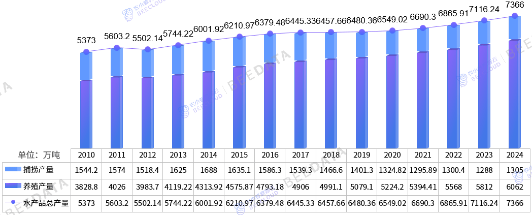 据国度统计局数据显示,中国水产物总产量70%以上来自养殖产量,2010年以来,除2012年外,中国水产物总产量均随养殖产量同步呈现逐年增加态势,2024年已增至7366万吨,同比增幅约3。5%;捕捞产量则受资本、天气变化以及休渔、禁渔和减船转产政策等分析要素影响,全体呈现波动下降趋向。