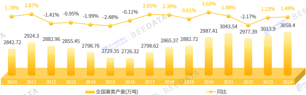 2024年,中国薯类产量为3058。4万吨,同比增加了1。48%——2023~2024年间已连增两年。