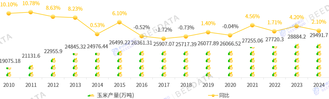 2024年,中国玉米产量为29491。7万吨,同比增加了2。1%——2021年至今已连增4年。