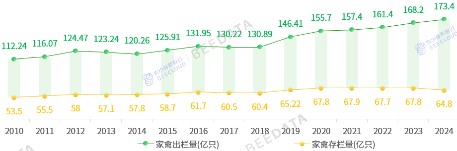 2024年,中国度禽出栏量为173。4亿只,同比增加了3。1%;存栏量则为64。8亿只,同比下降了4。5%。