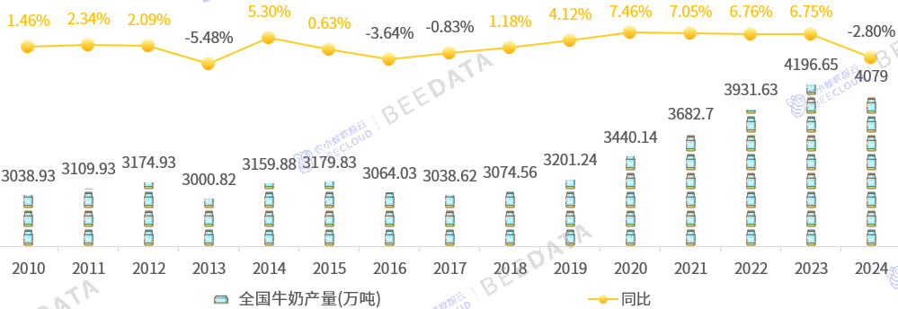 据国度统计局数据显示,2018~2023年来,中国牛奶产量已连增6年。2023年,中国牛奶产量初次以4197万吨冲破4000万吨;2024年回落至4079万吨、降幅约2。8%,但仍连结正在4000万吨以上。