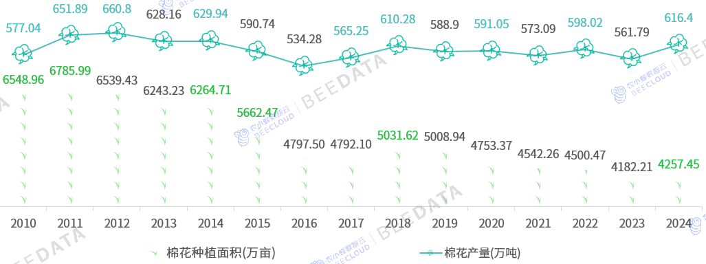 近年来,农户转种其它做物,国内棉花种植面积全体削减,棉花产量也随之波动下降。2024年,中国棉花种植面积为4257。45万亩、产量为616。4万吨,受年际间天气以及收购价钱波动等分析要素影响,同比别离较2023年回升了75。24万亩、54。61万吨,升幅别离为1。8%、9。72%。
