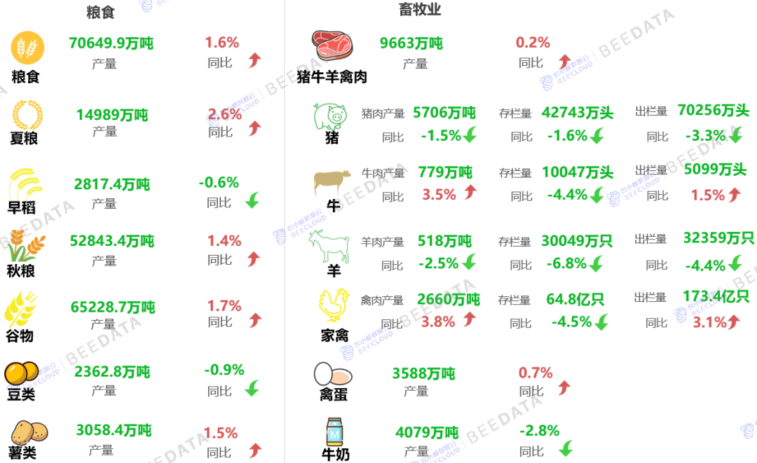 2024年,人们对肉类产物的需求仍然兴旺,但受进口冲击、市场行情波动、替代消费等分析要素影响,国内大畜禽存、出栏量均有所波动,肉类产量也随之同步变化至9663万吨,同比增加了0。2%。此中,猪肉产量为5706万吨,同比下降了1。5%;牛肉产量为779万吨,同比增加了3。5%;羊肉产量为518万吨,同比下降了2。5%;禽肉产量为2660万吨,同比增加了3。8%。