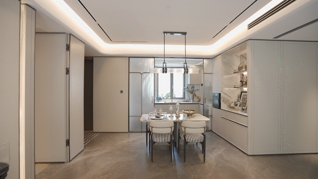 客堂、厨房地面采用希尔顿酒店御用的简一大理石连纹密封砖,约900*1800超大尺寸,可谓地砖界天花板;还有超薄悬浮吊顶设想,搭配皮革布景墙,空间款式不彰自显。